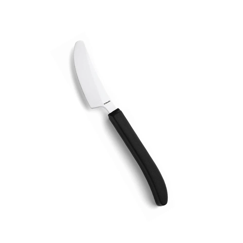Ergonomisk udformet Amefa kniv med sort greb. Serien findes i en lige og i en vinklet udgave. Den ergonomiske spisekniv kan anvendes til højre og venstre hånd.