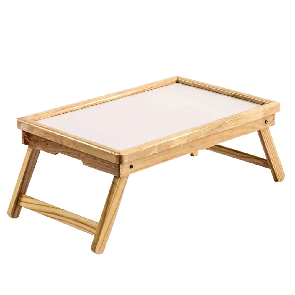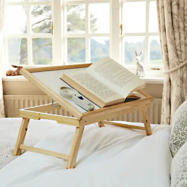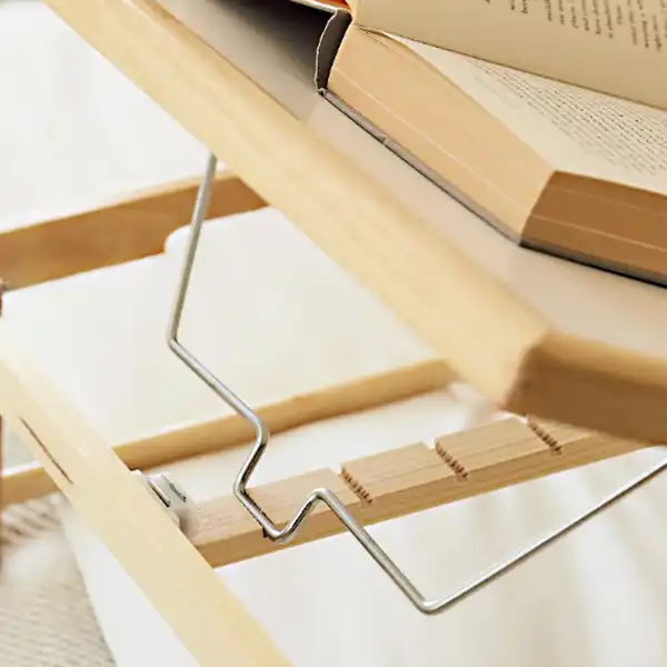 Flot bakke i lyst træ til sengen. Den anvendes, når du ønsker spise, mens du er i sengen. Bakken har en lamineret overflade, som gør den let at rengøre. Den øverste plade kan vinkles op til hele 45 grader, så kan du også skrive og læse, mens du sidder i sengen. Når du ikke bruger bakken, kan benene foldes sammen, så den ikke fylder så meget.
