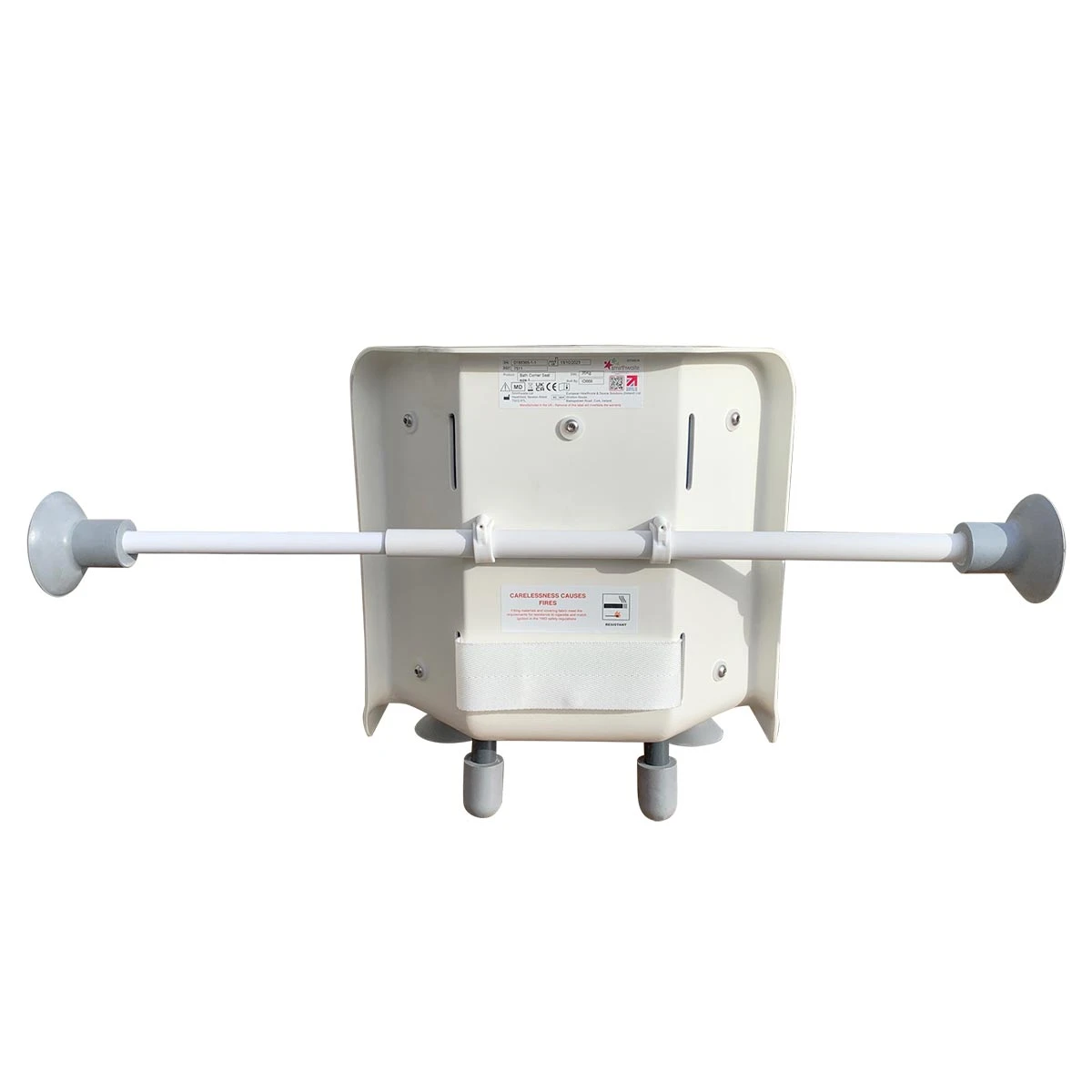Der medfølger 2 teleskopiske stænger, som fastsættes på siderne af badekarret. Den ene stang skal altid være monteret bagved sædet, inden det tages i brug.