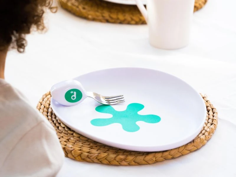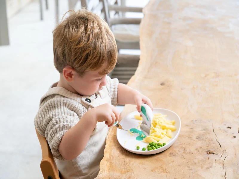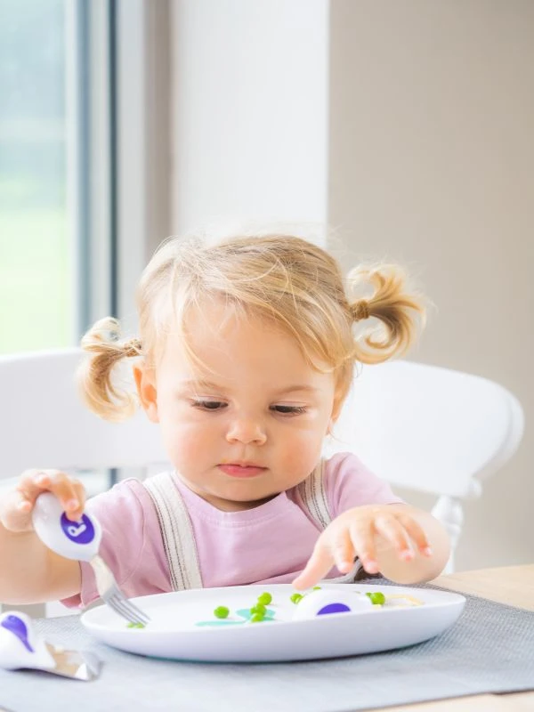 Doddl-tallerkenen er designet til at hjælpe børn med at lære de færdigheder, de skal bruge for at gå over til en “voksen” tallerken. Doddl-tallerkenen ligner en voksentallerken, men den forhøjede kant hjælper til at holde maden på tallerkenen. Den brede udformning med lav kant giver nem adgang til mad med bestik, hvor mere af tallerkenen er foran barnet. Sprøjte-mærket i tallerkens midte, hjælper barnet med at holde fokus på midten af tallerkenen, (hvor hakningen ideelt set skal finde sted), og bunden har en skridsikker kant, der holder tallerkenen stabil, mens dit barn øver sig i sine bestikfærdigheder.