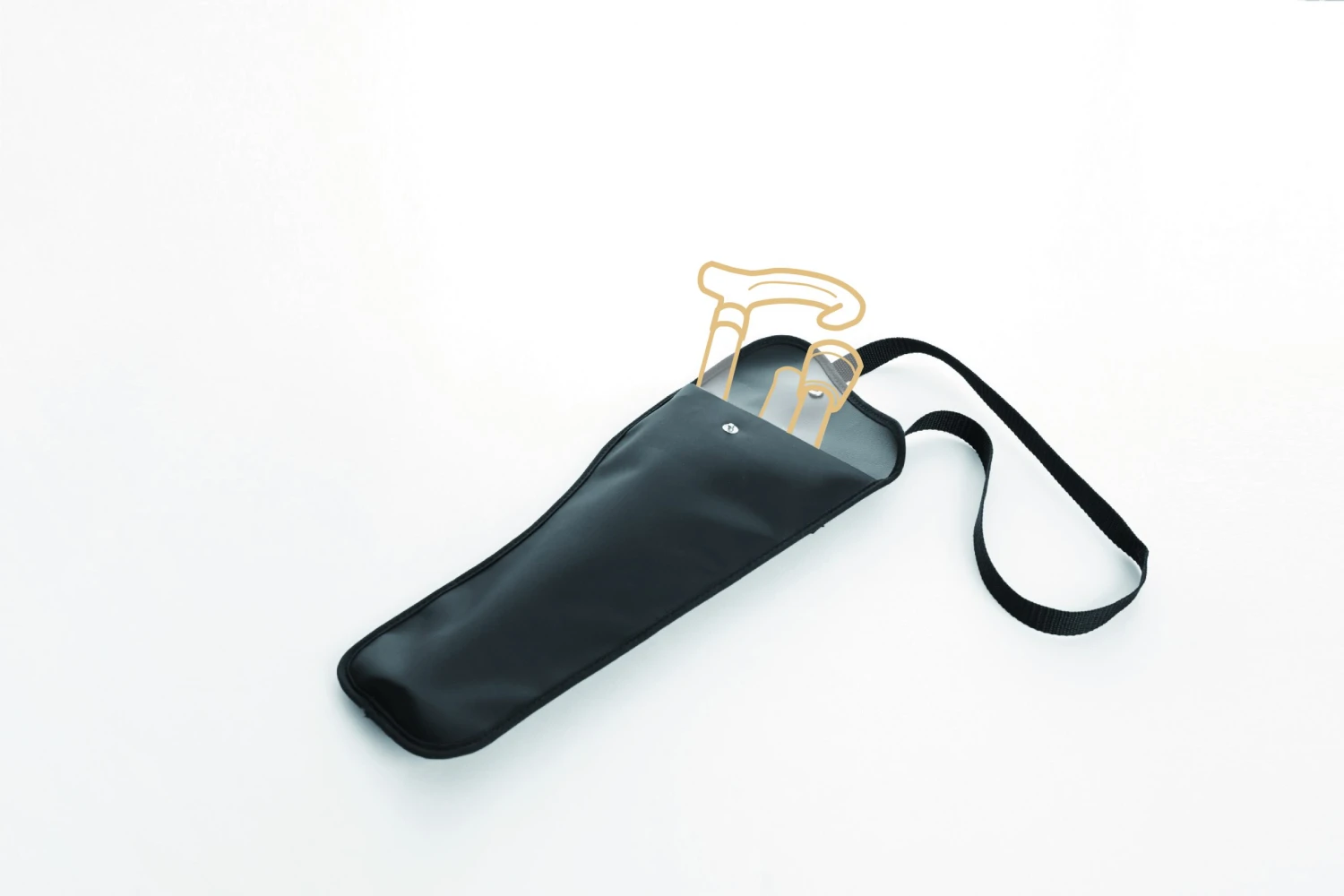 En sort taske til stok med rem og trykknap.