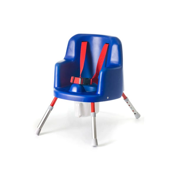 Pottestol i formstøbt plast, der er monteret på et stativ med højdeindstillelige ben, og løs potte samt stænkkile. Der er en H-sele, som er enkelt at justere.