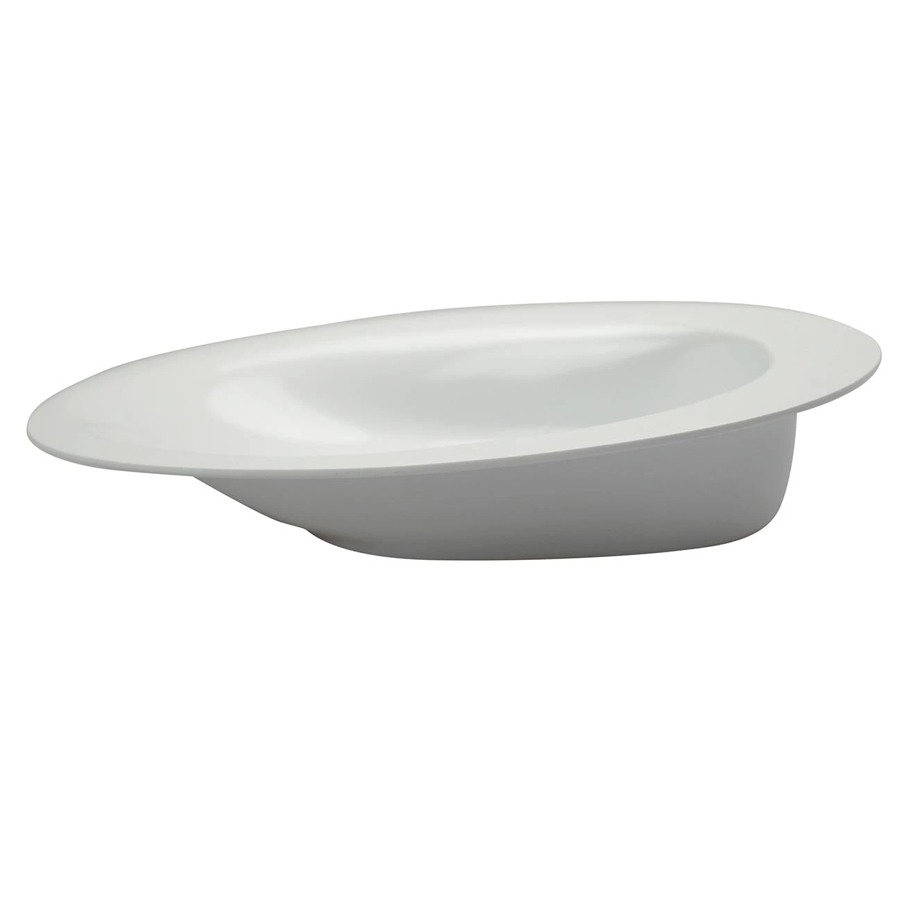 Oval tallerken med høj kant i den ene side som runder lidt indad, hvilket gør det lettere at få maden op på skeen/gaflen.