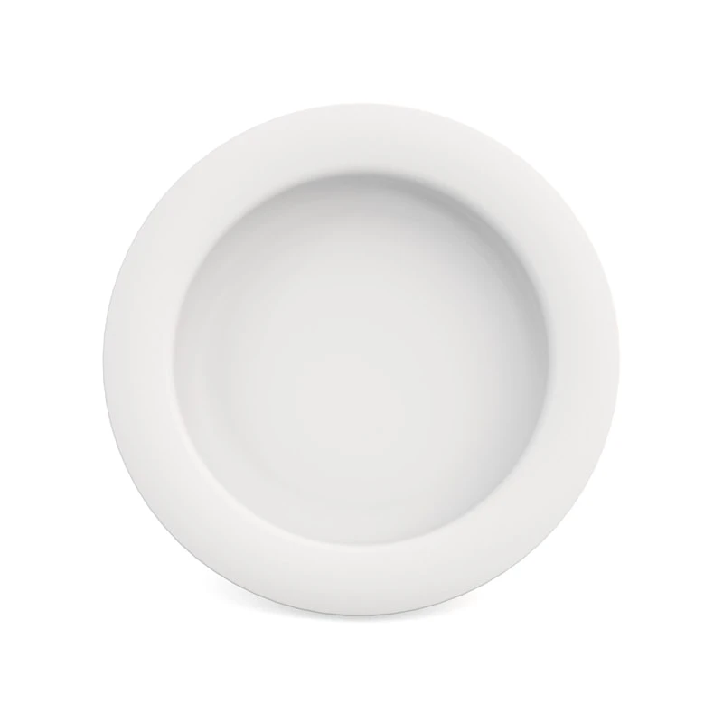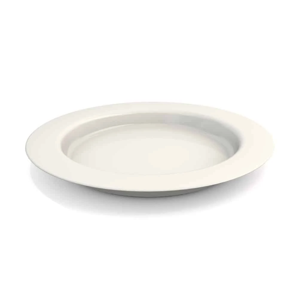 Hvid Melamin tallerkenen har en skrå bund, så maden er lettere at få op på bestikket. Tallerkenen har en skridsikker gummikant nedenunder, så den står bedre fast på bordet.