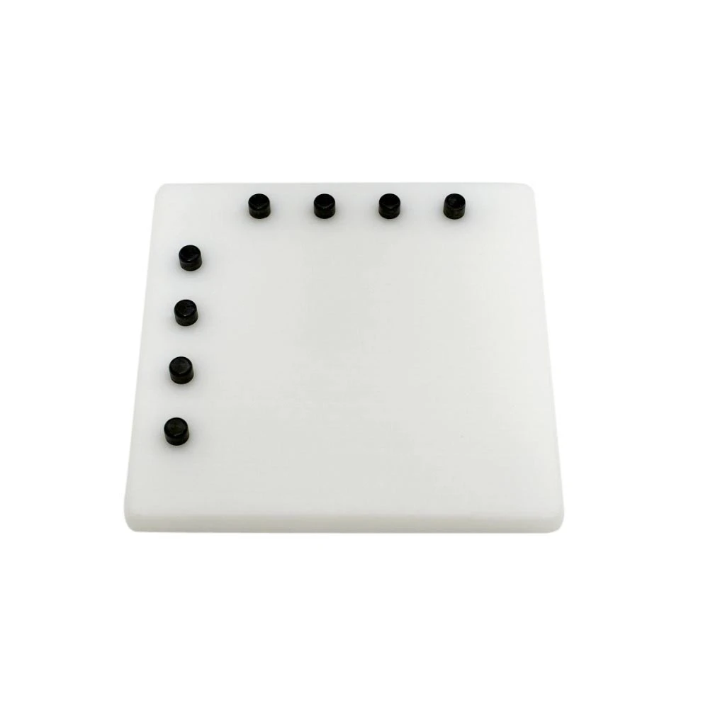 Hvidt smørebræt som er fremstillet i kunststof og er forsynet med 8 sorte knopper, som holder brødet på plads.