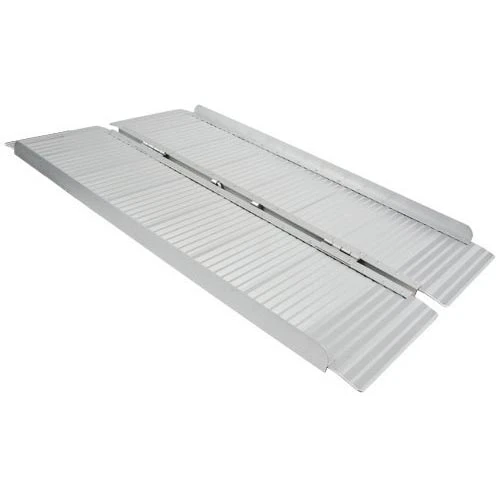 Det er en meget solid kørestolsrampe, da den er fremstillet i kraftig aluminium og kan tåle det omskiftelige danske vejr og vind. Jo længere rampen er – jo mere vejer den. Så vægten på rampen er fra 4,5 kg. – 18 kg. for de længste kørestolsramper.
