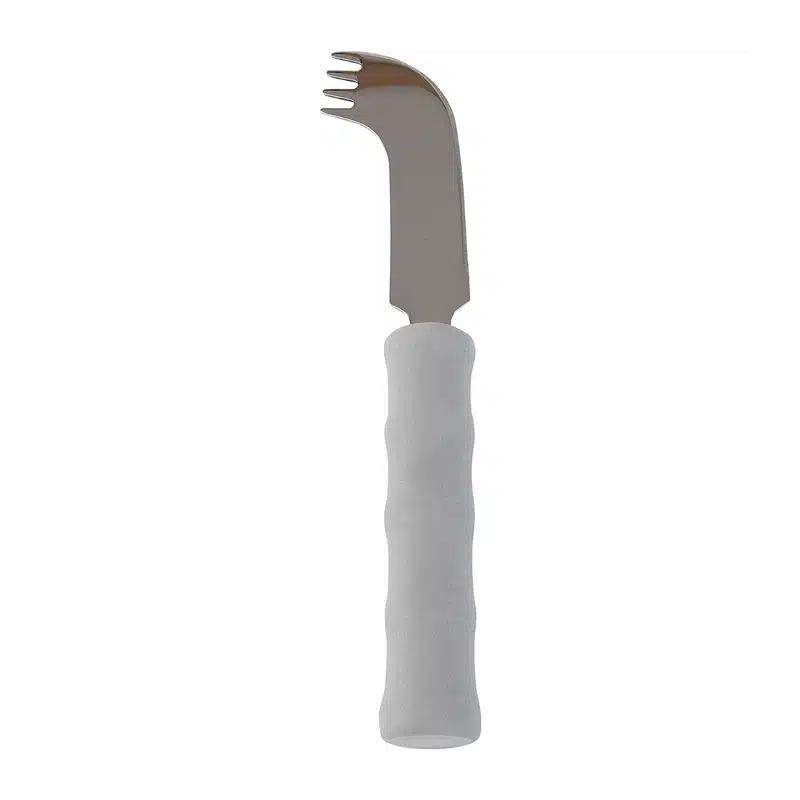 Denne kniv har et behageligt design, der gør den til et godt valg for folk med et svagt eller smertefuldt greb. Dette letvægtsbestik er et samlet bestik bestående af både kniv, gaffel og ske i ét. Klingen er bøjet og ender ud i en gaffel for enden som har en dyb afrundet skål, der også kan bruges som en ske. Det lette og rillede skumhåndtag giver et forbedret og mere sikkert greb om dette spiseredskab. Dette knorf redskab er i rustfrit stål og forseglet i lysegrå skumhåndtag. Rillerne i håndtaget gør bestikket nemmere at holde ordentlig på og giver et mere sikkert og smertefrit greb. Ideel til brug for personer med én hånd.