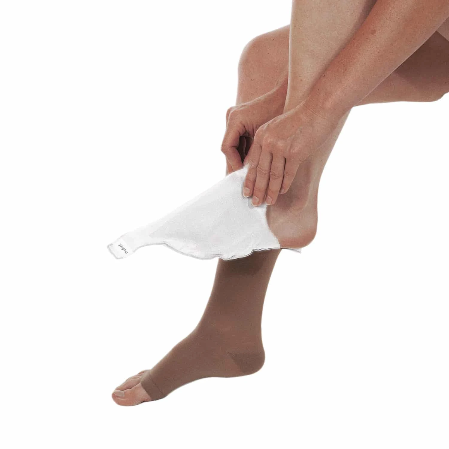 - Træk din kompressionsstrømpe med åben tå udover glidesokken.