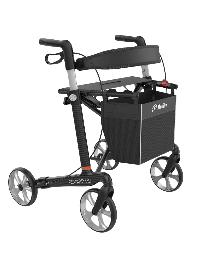 En Gepard rollator fra Mobilex er én af de letteste rollatorer, der findes på rollatormarkedet. Den lave vægt er med til at aflaste dig, da det er meget lettere at skubbe, dreje og løfte rollatoren. Det bliver betydeligt lettere at komme rundt i trafikken og ikke mindst komme over de besværlige kantstene. Vi oplever en stigende efterspørgsel efter rollatorer med lav vægt, og som dermed er lettere at få op i bagagerummet. Den ekstra lave vægt skyldes, at rollatoren er fremstillet i letvægtsmaterialet Kulfiber.