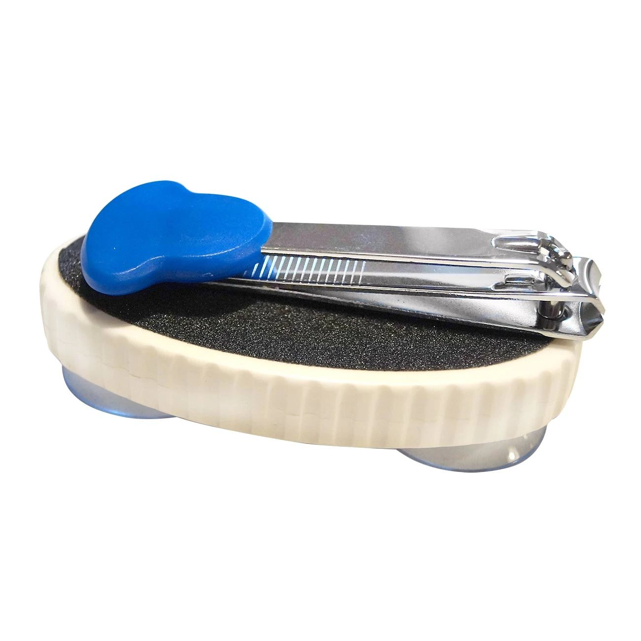 Negleklipper på plade med påmonteret neglefil på oversiden. Klipperen sikrer stabilitet og gør negleklipningen lettere, da den kan sidde fast på underlaget med sugekopperne, der sidder i bunden af pladen.