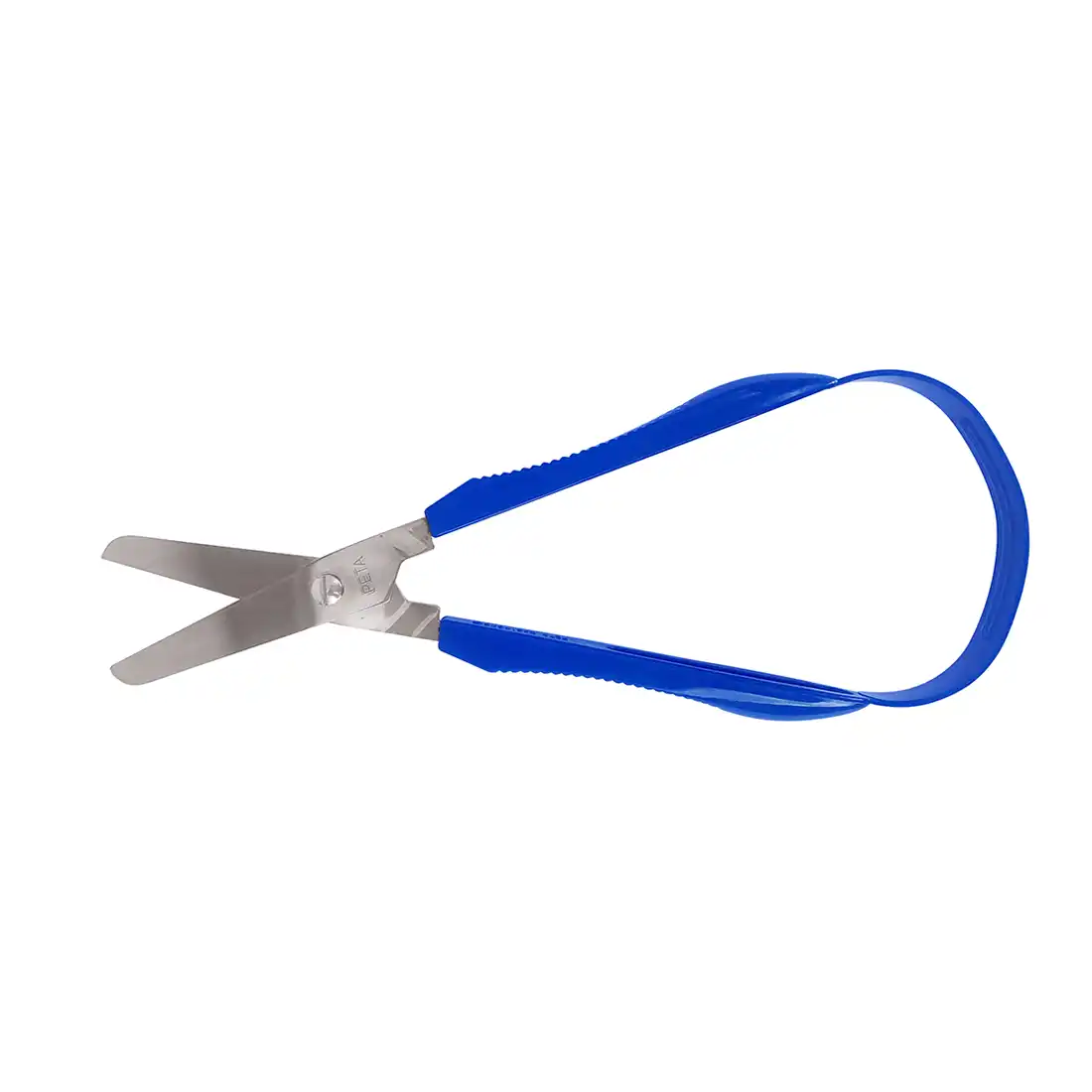 Børnevenlig bøjlesaks fra Peta til højre hånd. Den ultralette saks er med anatomisk formet greb og er selvåbnende. Den er desuden velegnet til både børn og voksne med nedsatte kræfter og svage hænder. Saksens bøjle gør, at saksen åbner sig selv. Der medfølger beskyttelseshætte til denne saks i blå.