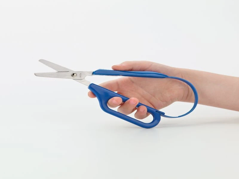Peta bøjlesaks til højre hånd med anatomisk formet greb. Bøjlesaksen er særligt velegnet til børn, men også til voksne med nedsatte kræfter og svage hænder. Saksens bøjle gør, at saksen åbner sig selv. Med Bøjlesaksen medfølger der beskyttelseshætte.