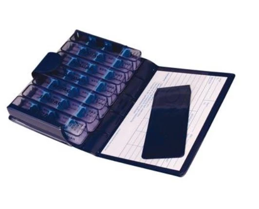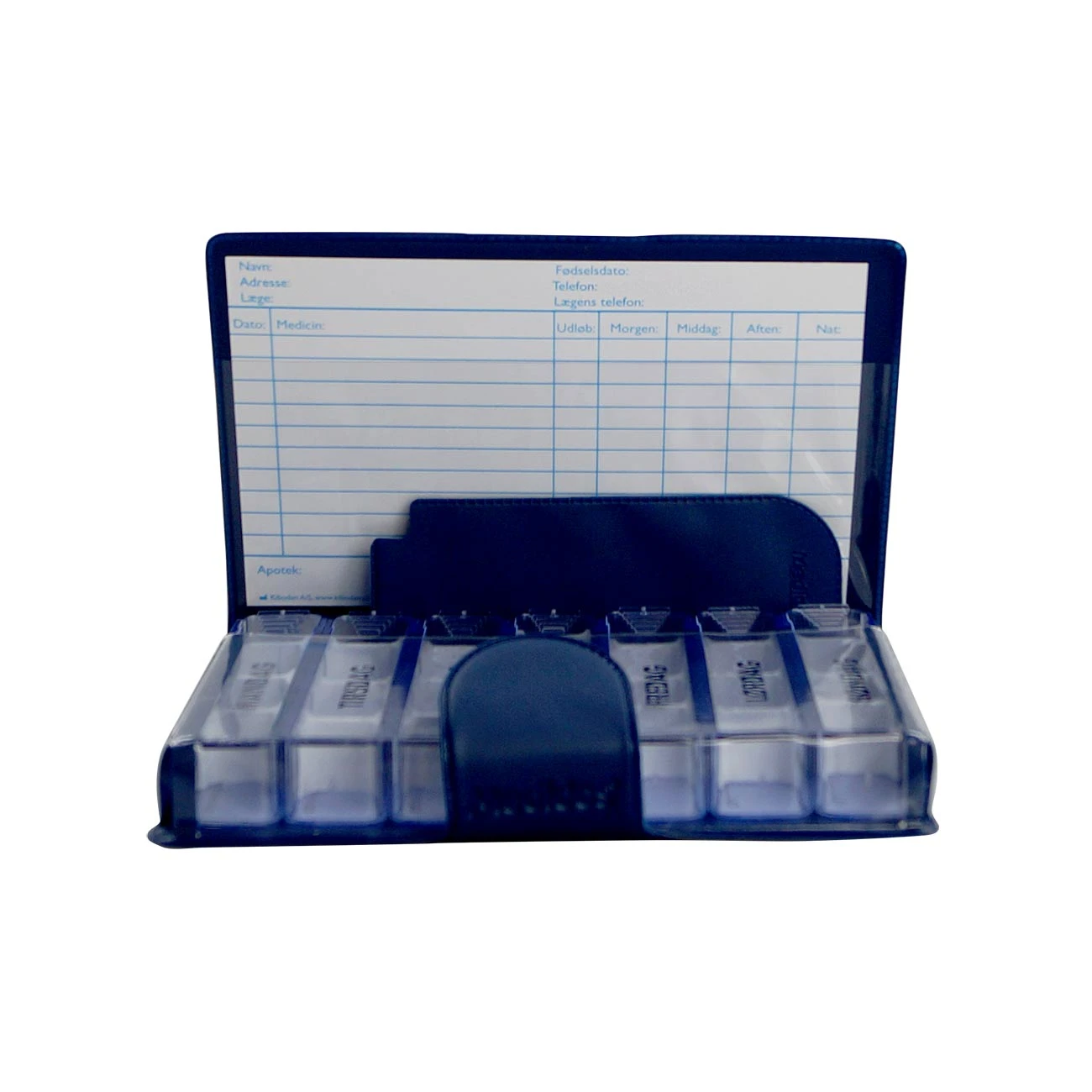Pilleæskerne ligger samlet i en blå vinyl kassette med velcro lukning. Hertil medfølger der yderligere et medicinkort.