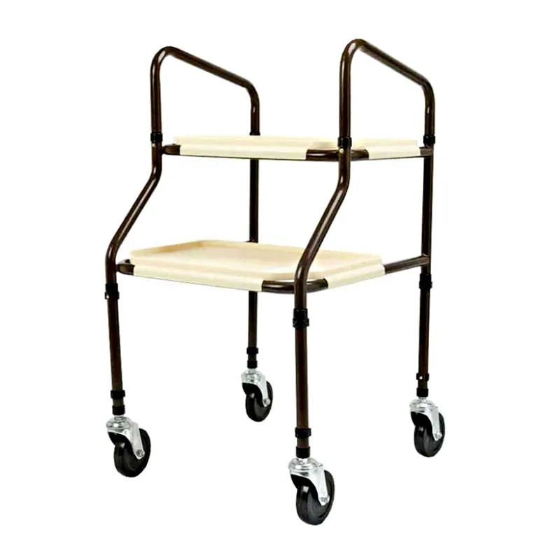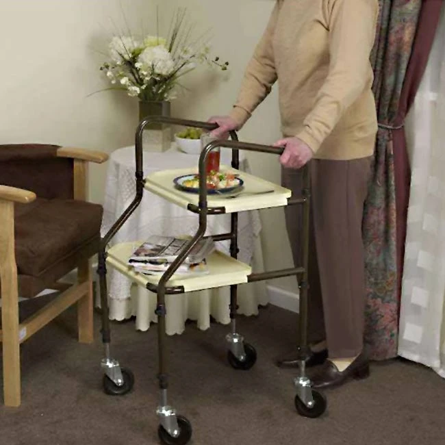 Den nederste bakke på serveringsvognen, er placeret fremad på selve rammen, så brugeren kan gå naturligt, når den skal skubbes rundt.