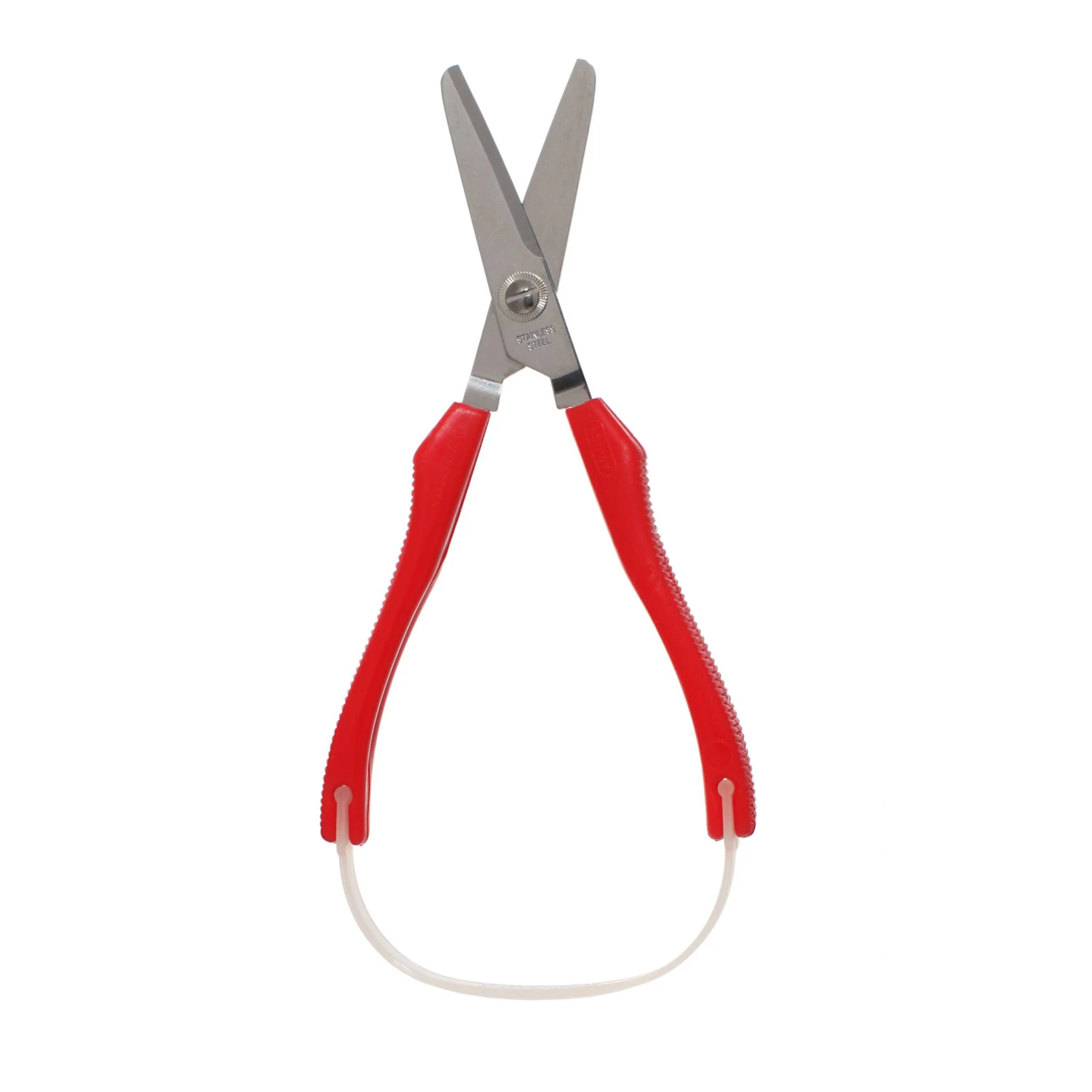 Bøjlesaks med rund klinge og et anatomisk udformet bøjlegreb. Fjederen i denne saks gør, at den automatisk åbner sig efter klip.