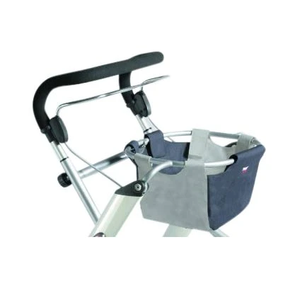 Stor kurv til Let’s Go indendørs rollatoren. Der er 15 cm dyb. Kurven fastgøres let til understøtningen med velcro, og det er stadig muligt at have bakken på samtidig med kurven.