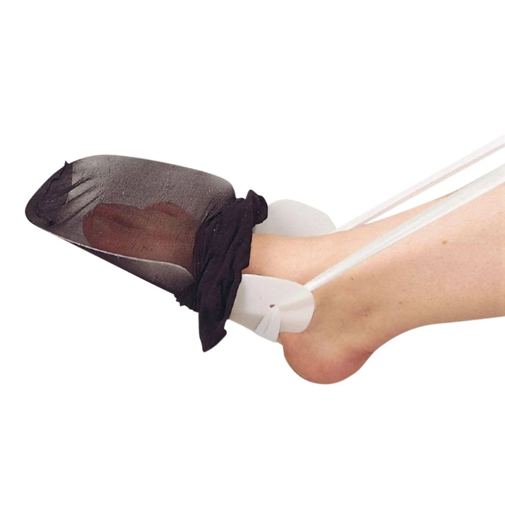 Strømpepåtageren er lavet af en bøjelig plastikplade, hvortil der er fastgjort 2 lange bomuldsbånd. Påtageren – en hjælp til strømper, er til påtagning af alle størrelser af strømper.