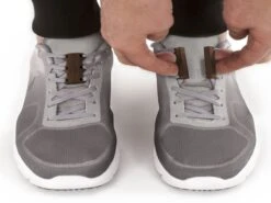 Ved påtagning sættes strømpen udover strømpepåtageren til den dækker hele påtageren. Læg strømpepåtageren på gulvet, og hold fast i de to lange bomuldssnore. Foden føres ind i den åbne ende af strømpen, herefter trækkes der i de 2 bånd, så strømpen trækkes op over foden og op ad benet.